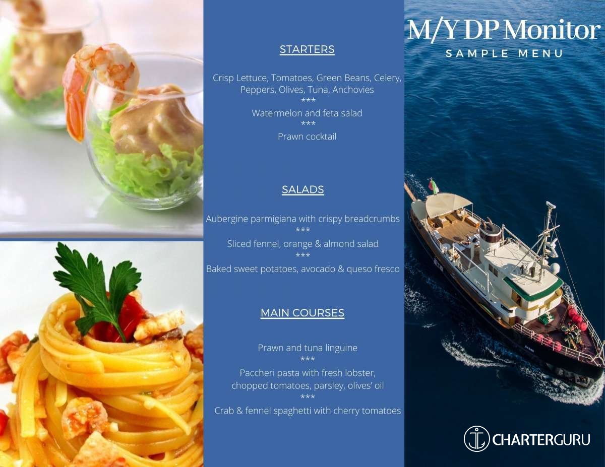 For a motor yacht like DP MONITOR, the expected APA is 25% to 40% of the charter price (€10,500 - €16,800), making the charter cost €52,500 to €58,800. Exact amount will be confirmed after inquiry.