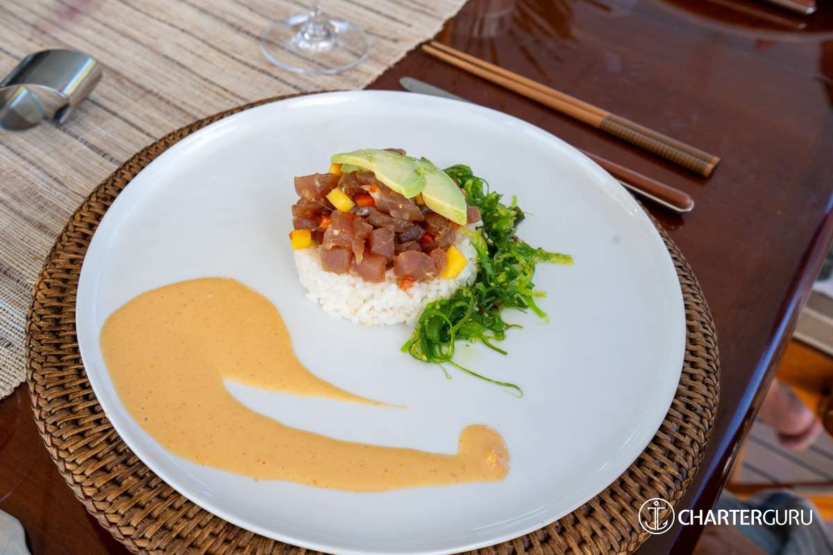 The crew was amazing. We got plated meals every time and the food was literally 5 stars. We had fun with all the toys : seabobs, kayak paddle board, lily pad, etc… Cory and Emily took amazing care of us, doing a crazy amount of work and still looking relaxed and always ready to go when we asked something.