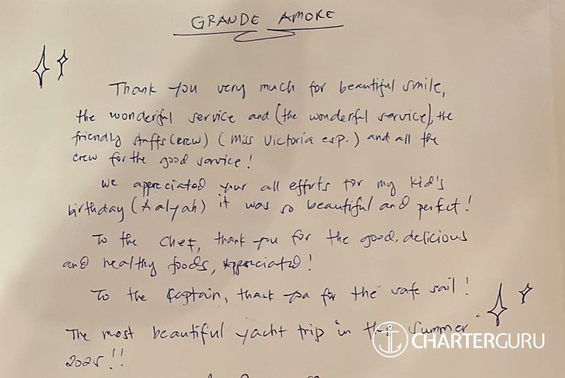 Overall, Grande Amore proved to be an excellent choice for my clients. I would fully recommend her to yours and I’m sure they would have a pleasant stay and a great charter experience!