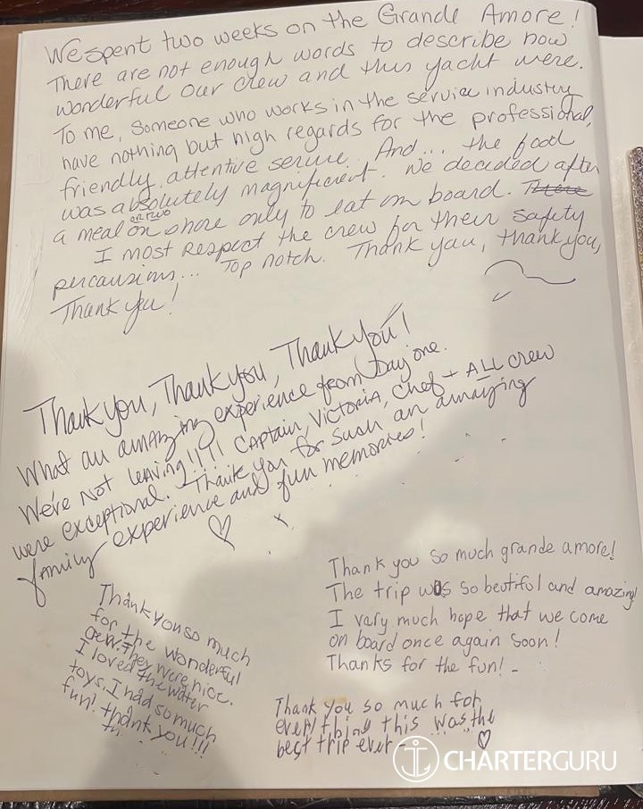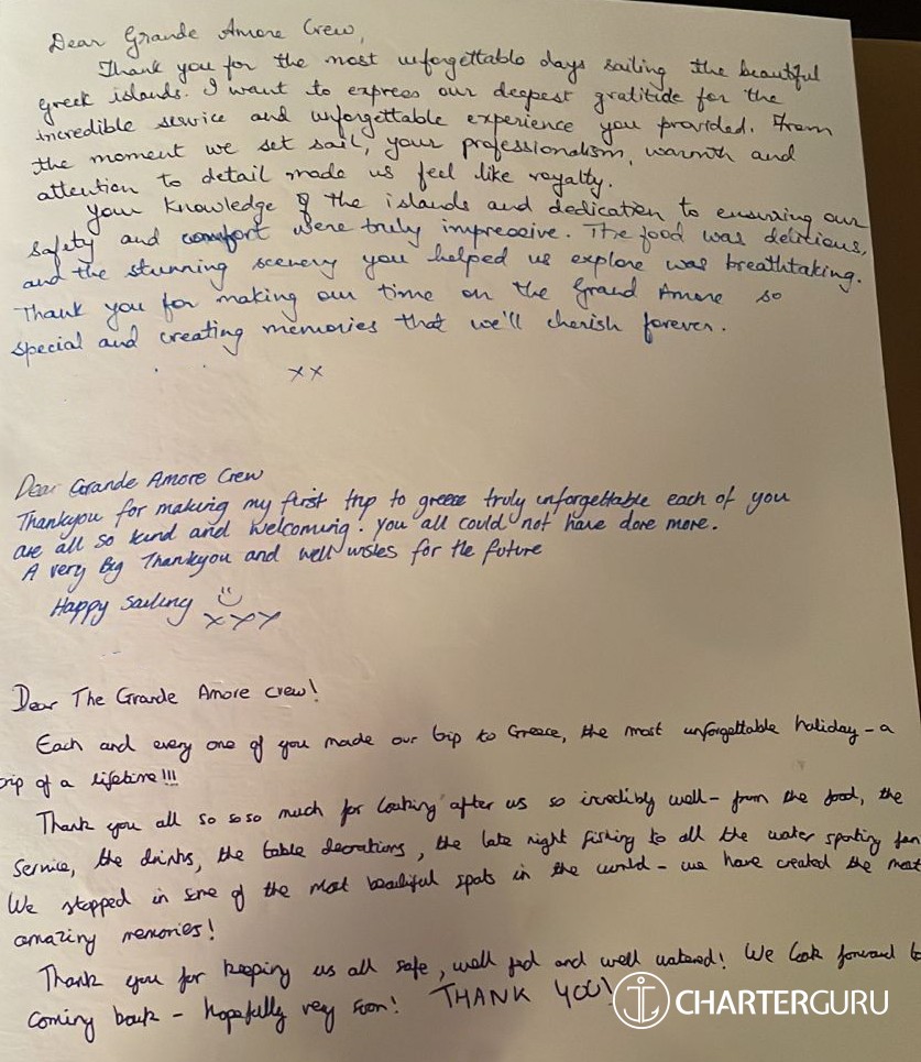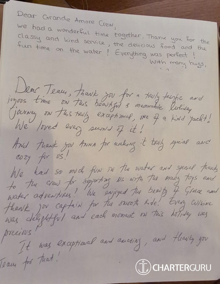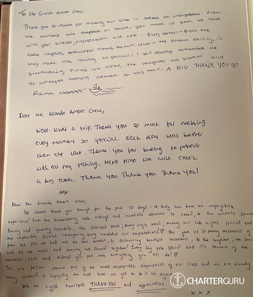 Thank you so much for making our time in Greece so unforgettable. From the moment we stepped on board, you made us feel at home with your kindness, professionalism, and care. Every detail - from the table layouts, beautiful meals, beach club, the smooth sailing - it truly made this holiday so special!!! I will always remember breathtaking places we visited, the laughs we shared, and the wonderful memories created on this boat. A BIG THANK YOU