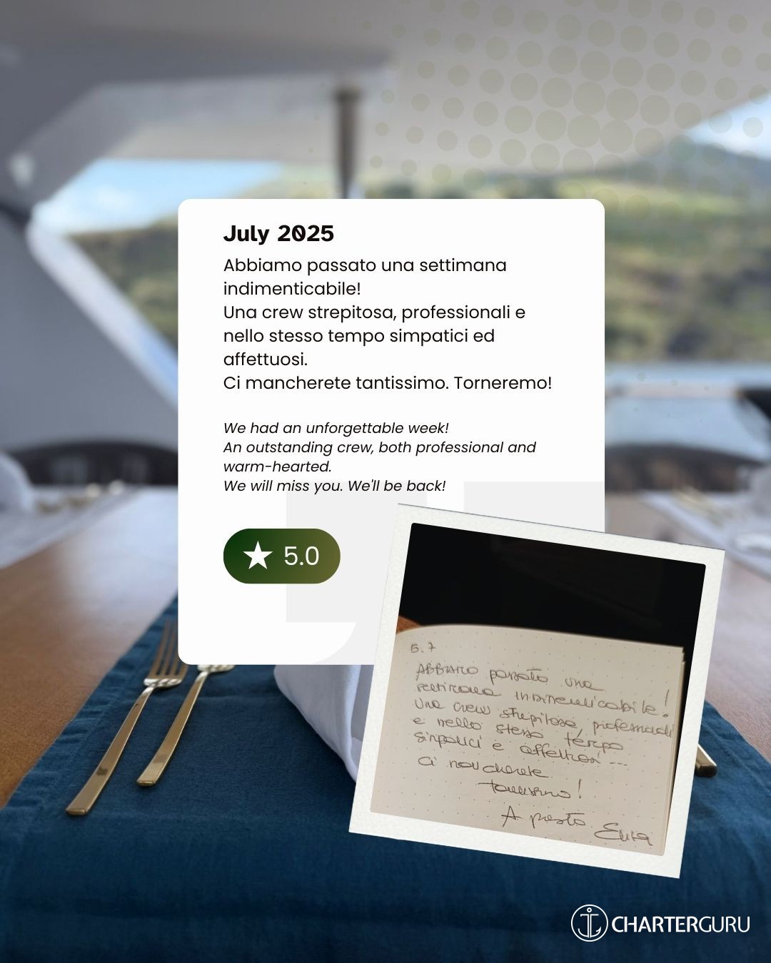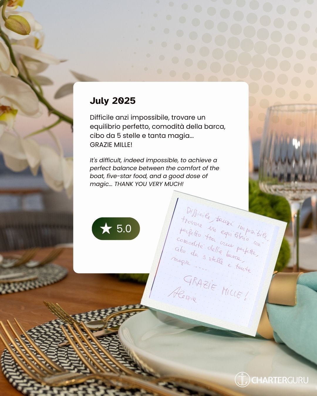 It's difficult, indeed impossible, to achieve a perfect balance between the comfort of the boat, five-star food, and a good dose of magic... THANK YOU VERY MUCH!