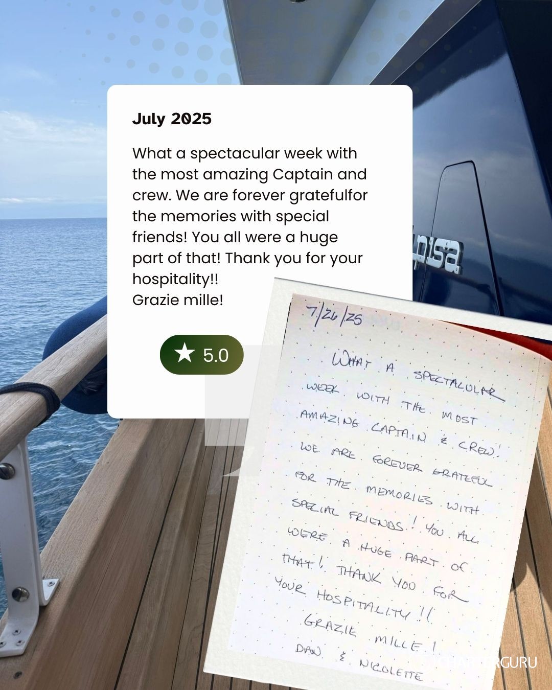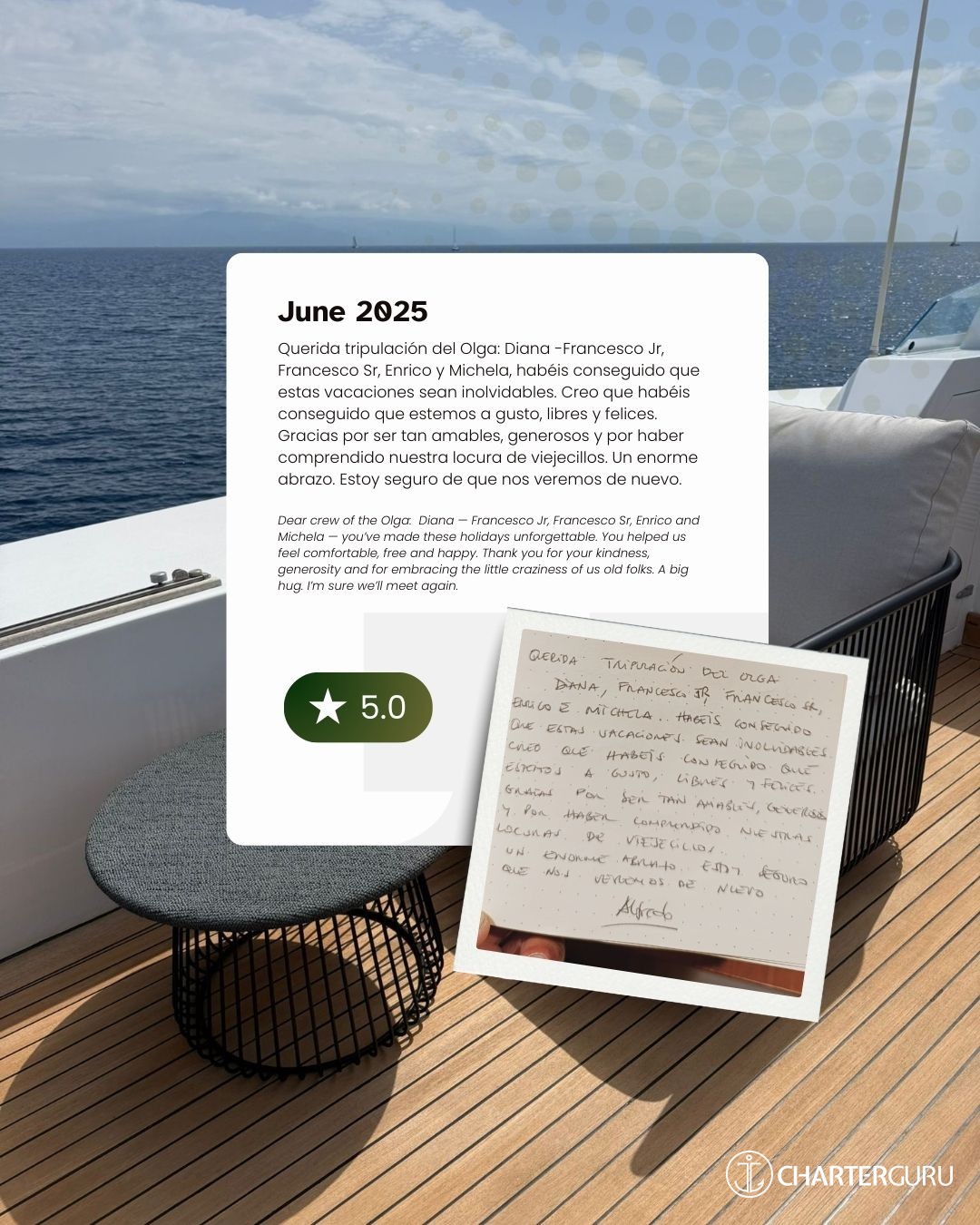Dear crew of the Olga: Diana — Francesco Jr, Francesco Sr, Enrico and Michela — you’ve made these holidays unforgettable. You helped us feel comfortable, free and happy. Thank you for your kindness, generosity and for embracing the little craziness of us old folks. A big hug. I’m sure we’ll meet again.
