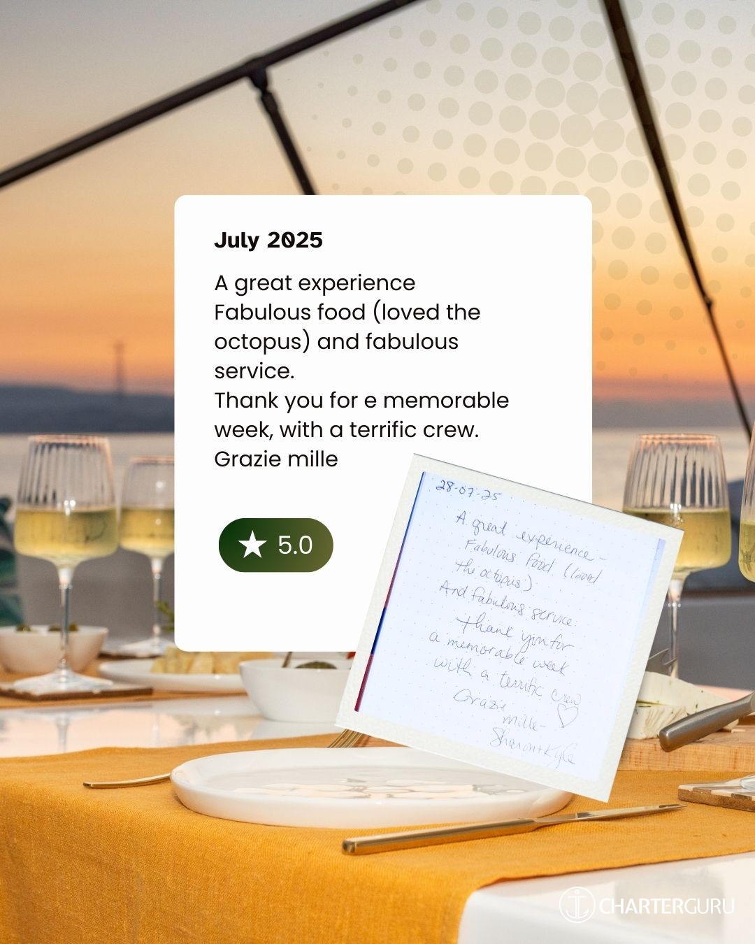 Ready for all our needs and expectations. Enrico is a fantastic chef! We had the opportunity to sail with him before and he is still the best! Very many thanks for the time we spent together and all the perfect time you gave to us!