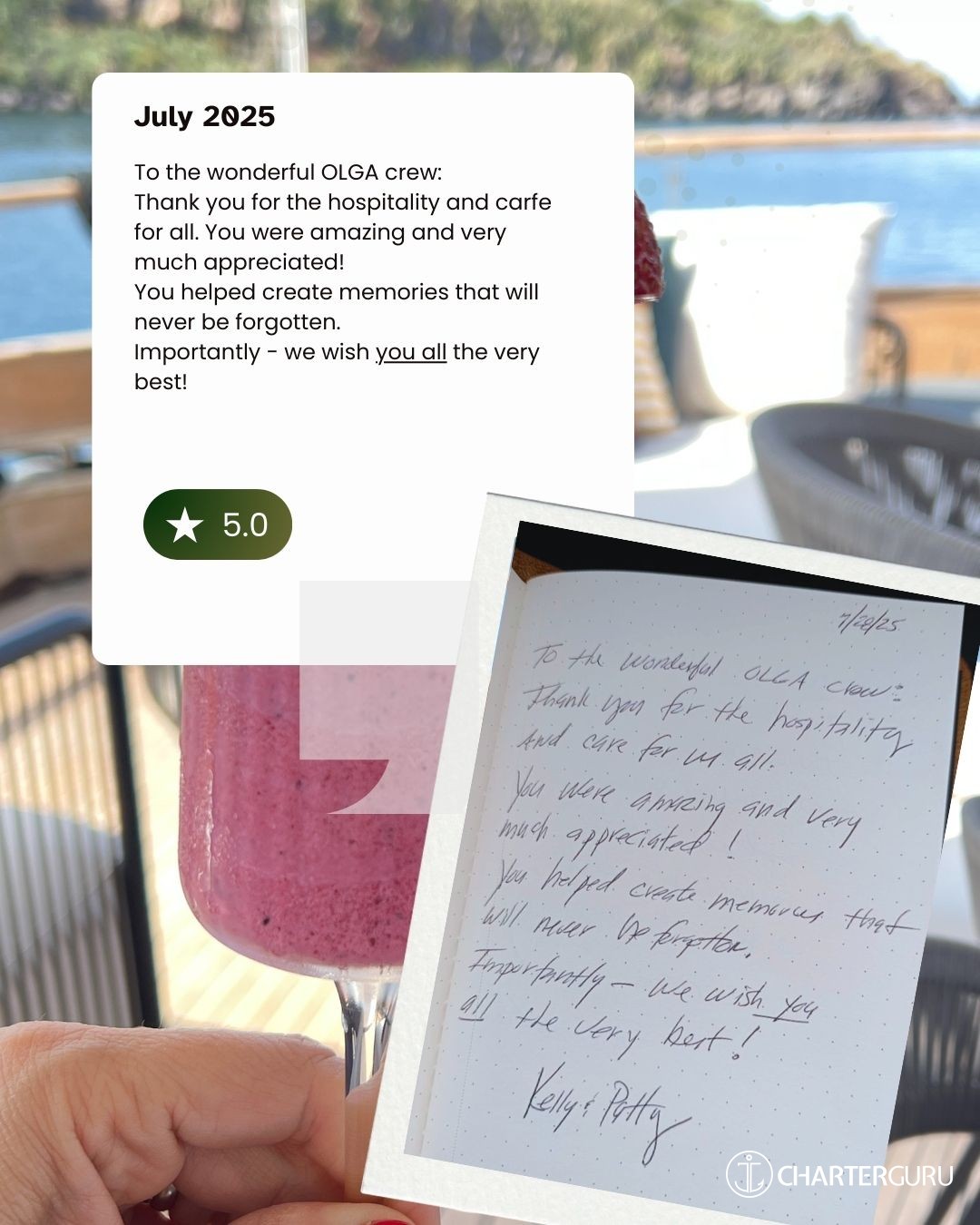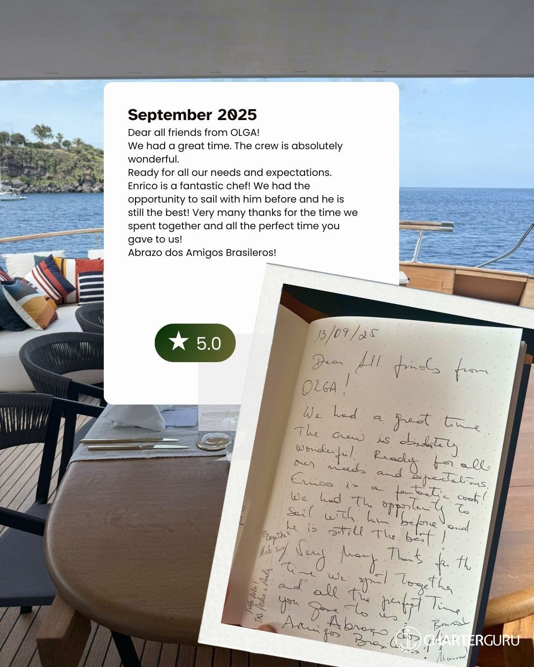 Olga is available for charter starting from 2024, after two-years refit concluded in 2025.