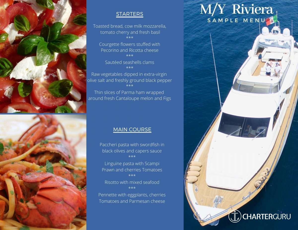 The stay aboard Riviera was fantastic. We really enjoyed the yacht, the itinerary, the Captain's professionalism, Maria's kindness and the delicious creations of Salvatore, an extraordinary chef, who pampered us for weeks on an unparalleled culinary journey. Thanks to the Captain's suggestions during the cruise, we enjoyed the stay, savoring all the pleasure and the freedom to go to sea.